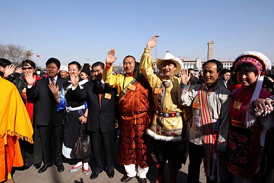 3月3日,中國人民政治協(xié)商會議第十一屆全國委員會第一次會議在北京人民大會堂開幕。這是幾名全國政協(xié)委員進入會場前愉快地招手致意。