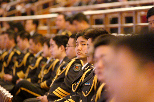 3月5日,第十一屆全國人民代表大會第一次會議在北京人民大會堂開幕。這是會議現(xiàn)場的軍樂團(tuán)在演奏間歇。