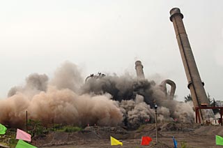 2007年9月5日,山東炸響拆除小火電“全國第一爆”。山東省微山湖煤電公司8臺燃煤小火電機(jī)組的主廠房和兩座煙囪被爆破拆除。新華社記者