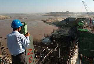 2007年10月22日,一名中國工人在蘇丹首都喀土穆以北的麥羅維大壩施工現(xiàn)場進(jìn)行測量。麥羅維大壩由中國水利電力對外公司和中國水利水電建設(shè)集團(tuán)公司承建,是迄今為止中國企業(yè)承包的最大國際工程,也是蘇丹乃至非洲目前在建的最大水電項(xiàng)目。新華社記者