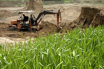 2007年5月21日,一輛鏟車在甘肅省臨夏市枹罕鎮(zhèn)的一處農(nóng)田邊取土,用于燒制國家早已明令禁止的實心磚瓦,當(dāng)?shù)?0多家磚瓦生產(chǎn)企業(yè)在基本農(nóng)田保護區(qū)范圍內(nèi)取土,造成上千畝水澆地大幅度減產(chǎn)甚至無法耕種。新華社發(fā)(資料照片) | “我國城市化、工業(yè)化的加速和目前建設(shè)用地緊缺的矛盾十分突出。2020年要達到城市化率60%、工業(yè)化率70%的目標(biāo),需要增加1.5億畝建設(shè)用地。而在18億畝耕地‘紅線’下,未來13年實際可以增加的建設(shè)用地不足3000萬畝。城市化與耕地保護之間面臨尖銳矛盾,必須妥善加以解決!”全國政協(xié)委員、清華大學(xué)人文學(xué)院經(jīng)濟研究所副所長蔡繼明接受記者采訪時對城市化與耕地保護這對矛盾表達了自己的憂慮。 和蔡繼明委員的關(guān)注相同,記者采訪發(fā)現(xiàn),在本次兩會上,如何妥善保護耕地這一話題在代表委員們中間引發(fā)了熱議,他們建議盡快促進農(nóng)村集體建設(shè)用地流轉(zhuǎn),同時,呼吁地方政府摒棄“賣地財政”行為。
