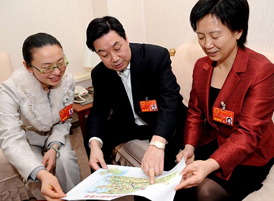 圖為來自河南的趙素萍代表(右)、來自甘肅的張津梁代表(中)和畢紅珍代表(左)在一起討論建議規(guī)劃建設(shè)線路示意圖。 |