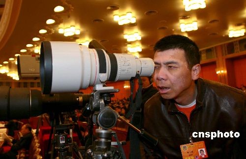 全國政協(xié)十一屆一次會(huì)議第二次全體會(huì)議在北京人民大會(huì)堂舉行。著名導(dǎo)演、北京電視藝術(shù)中心的馮小剛委員在大會(huì)堂借用攝影記者的長焦鏡頭細(xì)觀會(huì)場。