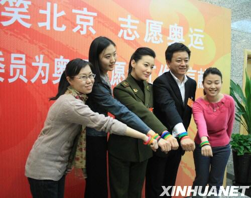 3月9日,全國(guó)人大代表譚晶(中)、全國(guó)政協(xié)委員朱軍(右二)和其他志愿者合影。 當(dāng)日,十幾位全國(guó)人大代表和全國(guó)政協(xié)委員一起來(lái)到中國(guó)國(guó)際會(huì)展中心,參加由北京奧組委舉辦的兩會(huì)代表委員獻(xiàn)計(jì)奧運(yùn)志愿者工作座談會(huì)。 新華社發(fā)