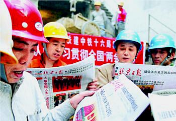 昨天(3月10日),承擔北京CBD地下通道工程建設的中鐵16局組織工人集體閱讀報紙,關注全國兩會。