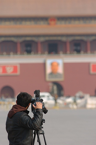3月14日,中國人民政治協(xié)商會議第十一屆全國委員會第一次會議在北京人民大會堂舉行閉幕會。圖為當日一名電視記者在廣場上拍攝外景。