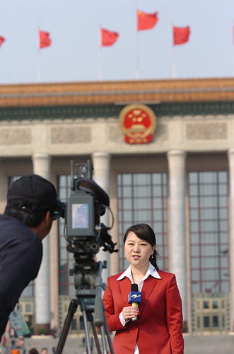 3月14日,中國人民政治協(xié)商會議第十一屆全國委員會第一次會議在北京人民大會堂舉行閉幕會。圖為當日電視記者在廣場上做現(xiàn)場報道。