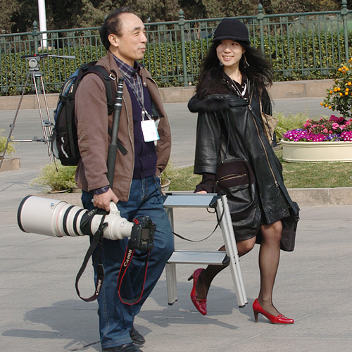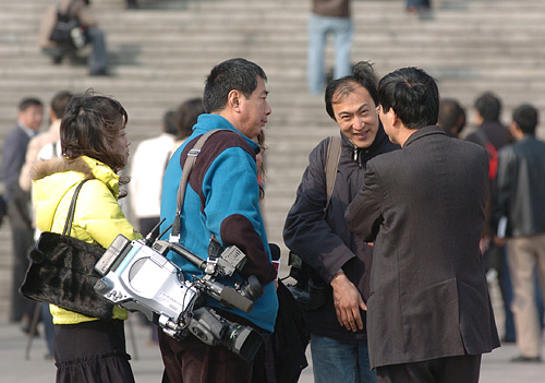 3月14日,中國人民政治協(xié)商會議第十一屆全國委員會第一次會議在北京人民大會堂舉行閉幕會。圖為當日在大會堂外的廣場上等候采訪的媒體記者。