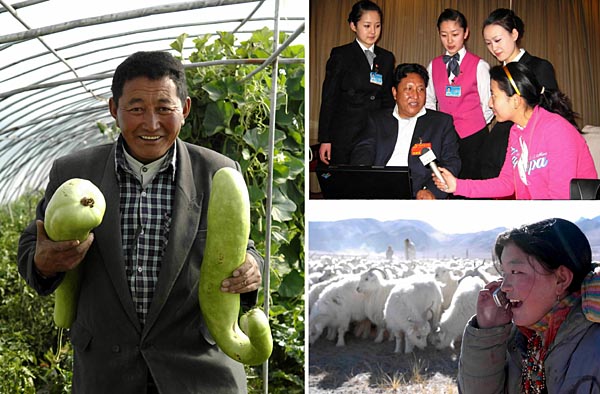 “阿里也有西瓜、蘋果?”聽了達(dá)娃扎西代表的介紹,在場(chǎng)的人無不感到驚奇。 面積34萬平方公里、人口僅8萬多的西藏阿里地區(qū)平均海拔5000米以上,因離“天”最近而被稱為“天上的阿里”。但因它寒冷缺氧、環(huán)境惡劣,長久以來又被稱為“生命禁區(qū)”。然而,阿里行署專員達(dá)娃扎西代表卻用事實(shí)告訴人們:如今,阿里與全國一樣發(fā)生了巨大變化。 聽說達(dá)娃扎西代表要向記者介紹“天上的阿里”,一些賓館工作人員也好奇地聚集過來。 “去年阿里地區(qū)農(nóng)牧民西瓜、蘋果的收入就有100多萬元!边_(dá)娃扎西介紹,近年來阿里大力發(fā)展白絨山羊養(yǎng)殖、神山圣湖礦泉水生產(chǎn)、無公害果蔬種植,以及旅游業(yè)、特色優(yōu)礦產(chǎn)業(yè)開發(fā)等,去年地區(qū)生產(chǎn)總值突破14億元,比5年前增加了兩倍,農(nóng)牧民人均純收入連續(xù)5年保持兩位數(shù)增長,去年達(dá)到2483元。 “你們看,這就是白絨山羊,一只羊的毛絨能賣2000多元,全地區(qū)1100多個(gè)示范戶光靠這‘軟黃金’去年總收入就有3億多元!边_(dá)娃扎西點(diǎn)擊著電腦上的一張張圖片介紹說,古格王國遺址、扎達(dá)土林風(fēng)光、神山圣湖等古跡和自然美景也吸引著越來越多的游客。農(nóng)牧民通過牦牛運(yùn)輸、家庭旅館等方式也賺了不少“現(xiàn)票票”。 “我們阿里生存環(huán)境相對(duì)來說是有點(diǎn)苦,但在全國人民的關(guān)心幫助下,日子越過越有希望。”達(dá)娃扎西說,“隨著阿里機(jī)場(chǎng)的興建、新藏公路的改擴(kuò)建等大型工程上馬,阿里會(huì)迎來更大的變化,群眾也將會(huì)有更多的致富機(jī)會(huì)! “真是想不到,阿里竟然這么美,群眾也過上了好日子!睅酌e館工作人員嘖嘖稱奇。 聽到這話,達(dá)娃扎西高興地說:“我代表阿里人民歡迎大家來阿里觀光!” 右上圖:全國人大代表達(dá)娃扎西在介紹阿里發(fā)生的巨大變化。 右下圖:西藏阿里地區(qū)日土縣藏族牧羊女次仁珠吉放牧著被譽(yù)為能產(chǎn)“軟黃金”的白絨山羊(資料照片)。 左圖:西藏阿里地區(qū)普蘭縣農(nóng)民歐珠在展示海拔3800多米的太陽能溫室種出的蔬菜(資料照片)。 |