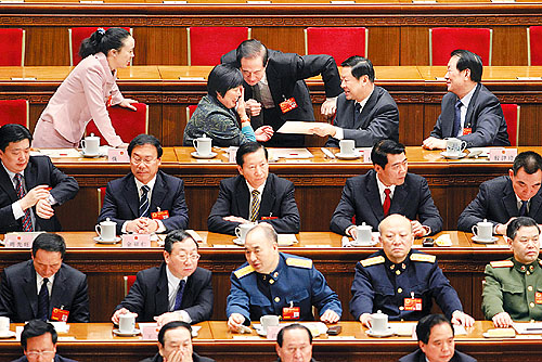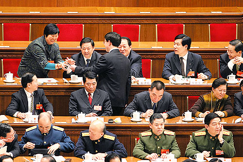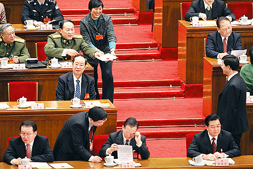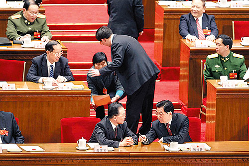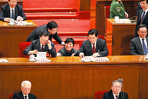 ①3月17日15時(shí)36分,監(jiān)票人員正在統(tǒng)計(jì)選票,大會(huì)稍事休息。一位女代表想請(qǐng)胡錦濤主席簽名,被一位工作人員勸阻。這位女代表叫謝木蘭,是江西省余干縣瑞洪鎮(zhèn)鎮(zhèn)郊村婦女主任。看到胡錦濤和溫家寶正在交談,謝木蘭仍不想放棄這次機(jī)會(huì)。