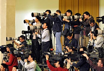 3月18日,國務(wù)院總理溫家寶和副總理李克強(qiáng)、回良玉、張德江、王岐山在北京人民大會堂與中外記者見面,并回答記者提問。這是攝影、攝像記者在現(xiàn)場采訪拍攝。新華社記者