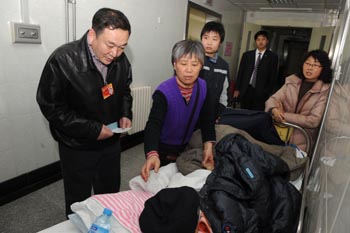 這是3月9日,全國政協(xié)委員卞志良(左一)在北京朝陽醫(yī)院看望一位等候就醫(yī)的患者。卞志良利用休會(huì)的半天時(shí)間,專程前往北京朝陽醫(yī)院,就醫(yī)療改革進(jìn)行走訪調(diào)研。他著重對(duì)藥品價(jià)格,看病難、用藥貴等問題征詢了醫(yī)患雙方的意見,希望以此進(jìn)一步完善有關(guān)城鄉(xiāng)醫(yī)療改革的提案。