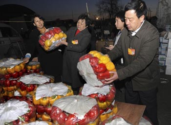 3月12日凌晨,來自山東的三位基層人大代表劉建文(左一)、王銀香(左二)和牛寶偉(右一)趕到北京新發(fā)地批發(fā)市場,聽取市場內(nèi)物流、批發(fā)商以及市民的意見。