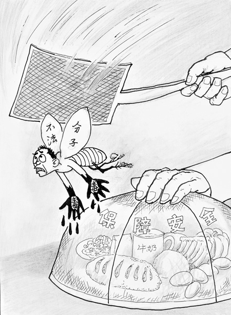 據(jù)《新華每日電訊》報道,西寧市一外來務工人員用含有致癌物的皮革防腐劑、工業(yè)鹽加工了53噸腌菜陸續(xù)出售,已被刑事拘留。近年來食品安全事件時有發(fā)生,食品安全問題已令廣大消費者心生疑慮。目前我國食品安全法草案正在廣泛征求社會意見,由此建議:應對制造食品安全事件的相關責任人要格外嚴厲處罰,讓違法者賠得傾家蕩產,才能起到“殺一儆百”的警示威懾作用!懊褚允碁樘臁保尣话踩氖称愤h離百姓生活。