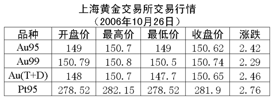 26日,上海黃金交易所黃金各個交易品種全線上漲,Au99.95收盤于150.62元/克,上漲2.42元/克,共成交1494公斤;黃金Au99.99收盤于150.74元/克,上漲2.29元/克,共成交374.80公斤;鉑金Pt99.95收盤于281.90元/克,上漲2.76元/克,共成交74公斤;黃金Au(T+D)延期交易品種收盤于150.65元/克,上漲2.46元/克,共成交2760公斤。