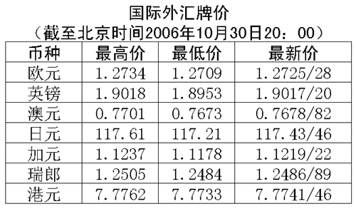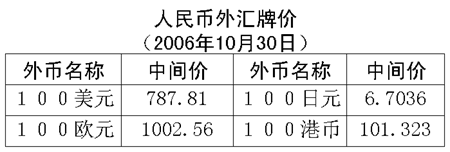 根據(jù)中國人民銀行授權中國外匯交易中心發(fā)布的公告,2006年10月30日銀行間外匯市場美元等交易貨幣對人民幣匯率的中間價為:1美元兌人民幣7.8781元,1歐元兌人民幣10.0256元,100日元兌人民幣6.7036元,1港元兌人民幣1.01323元,1英鎊兌人民幣14.9461元。