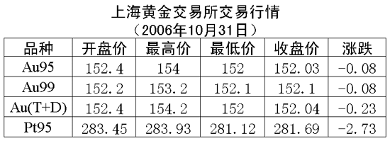 31日,上海黃金交易所各個(gè)交易品種全線下跌。黃金Au99.95收盤于152.03元/克,下跌0.08元/克,共成交2394公斤;黃金Au99.99收盤于152.10元/克,下跌0.08元/克,共成交809公斤;鉑金Pt99.95收盤于281.69元/克,下跌2.73元/克,共成交132公斤;黃金Au(T+D)延期交易品種收盤于152.04元/克,下跌0.23元/克,共成交4144公斤。上海黃金交易所白銀Ag(T+D)延期交易品種收盤于3373.00元/公斤,下跌1.00元/公斤,共成交28公斤;現(xiàn)貨白銀Ag99.9沒有成交。