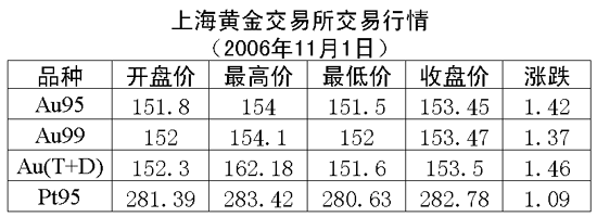 1日,上海黃金交易所各個(gè)交易品種全線上漲,黃金Au99.95收盤于153.45元/克,上漲1.42元/克,共成交2222公斤;黃金Au99.99收盤于153.47元/克,上漲1.37元/克,共成交750公斤;鉑金Pt99.95收盤于282.78元/克,上漲1.09元/克,共成交380公斤;黃金Au(T+D)延期交易品種收盤于153.50元/克,上漲1.46元/克,共成交4650公斤。