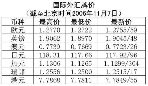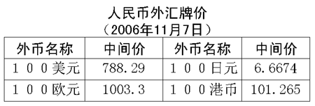 根據(jù)中國人民銀行授權(quán)中國外匯交易中心發(fā)布的公告,2006年11月7日銀行間外匯市場美元等交易貨幣對人民幣匯率的中間價(jià)為:1美元兌人民幣7.8829元,1歐元兌人民幣10.0330元,100日元兌人民幣6.6674元,1港幣兌人民幣1.01265元,1英鎊兌人民幣14.9694元。