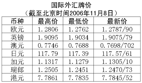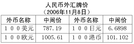根據(jù)中國(guó)人民銀行授權(quán)中國(guó)外匯交易中心發(fā)布的公告,2006年11月8日銀行間外匯市場(chǎng)美元等交易貨幣對(duì)人民幣匯率的中間價(jià)為:1美元兌人民幣7.8719元,1歐元兌人民幣10.0561元,100日元兌人民幣6.6898元,1港幣兌人民幣1.01102元,1英鎊兌人民幣15.0027元。