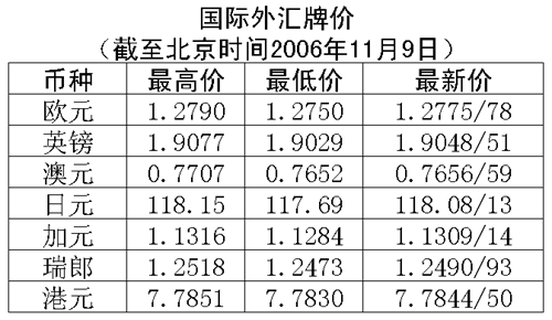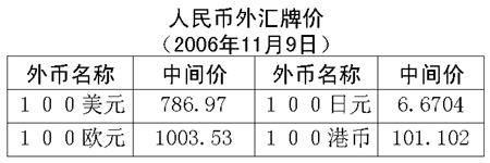 根據(jù)中國人民銀行授權(quán)中國外匯交易中心發(fā)布的公告,2006年11月9日銀行間外匯市場美元等交易貨幣對人民幣匯率的中間價(jià)為:1美元兌人民幣7.8697元,1歐元兌人民幣10.0353元,100日元兌人民幣6.6704元,1港幣兌人民幣1.01102元,1英鎊兌人民幣14.9785元。