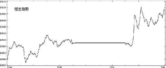 15日,香港恒生指數(shù)早盤高開62點(diǎn)后,在中移動(dòng)帶動(dòng)下,市況進(jìn)一步向好,并升穿19000點(diǎn)關(guān)口。至收盤上漲214.58點(diǎn),漲幅1.14%,報(bào)19093點(diǎn)。