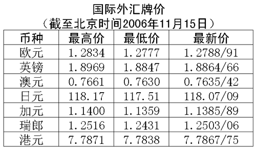 根據(jù)中國(guó)人民銀行授權(quán)中國(guó)外匯交易中心發(fā)布的公告,2006年11月15日銀行間外匯市場(chǎng)美元等交易貨幣對(duì)人民幣匯率的中間價(jià)為:1美元兌人民幣7.8715元,1歐元兌人民幣10.0839元,100日元兌人民幣6.6895元,1港幣兌人民幣1.01105元,1英鎊兌人民幣14.9251元。