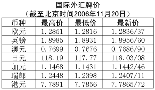 根據(jù)中國人民銀行授權(quán)中國外匯交易中心發(fā)布的公告,2006年11月20日銀行間外匯市場美元等交易貨幣對人民幣匯率的中間價為:1美元兌人民幣7.8690元,1歐元兌人民幣10.0923元,100日元兌人民幣6.6732元,1港幣兌人民幣1.01043元,1英鎊兌人民幣14.9062元。