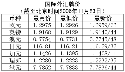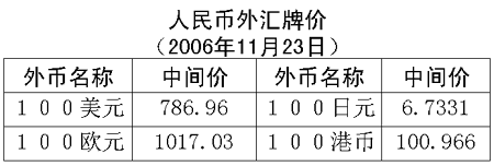 根據(jù)中國人民銀行授權(quán)中國外匯交易中心發(fā)布的公告,2006年11月23日銀行間外匯市場美元等交易貨幣對人民幣匯率的中間價(jià)為:1美元兌人民幣7.8596元,1歐元兌人民幣10.1703元,100日元兌人民幣6.7331元,1港幣兌人民幣1.00966元,1英鎊兌人民幣15.0452元。人民幣對美元匯率中間價(jià)設(shè)定為7.8596,為歷史最低。