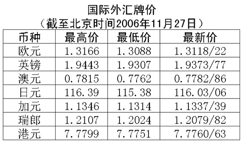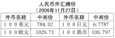 根據(jù)中國(guó)人民銀行授權(quán)中國(guó)外匯交易中心發(fā)布的公告,2006年11月27日銀行間外匯市場(chǎng)美元等交易貨幣對(duì)人民幣匯率的中間價(jià)為:1美元兌人民幣7.8402元,1歐元兌人民幣10.2971元,100日元兌人民幣6.7787元,1港幣兌人民幣1.00797元,1英鎊兌人民幣15.2001元。在自動(dòng)撮合交易系統(tǒng),美元收于人民幣7.8428元,低于24日收盤時(shí)的7.8506元,盤中交易區(qū)為人民幣7.8432-7.8406元。在詢價(jià)交易市場(chǎng),美元收于人民幣7.8436元,低于24日收盤時(shí)的7.8525元,盤中交易區(qū)為人民幣7.8441-7.8410元。