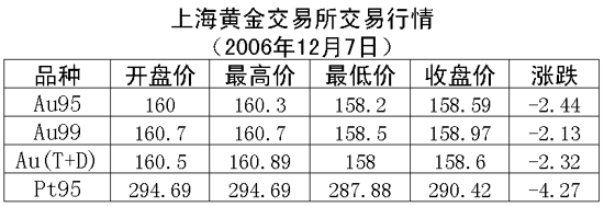 7日,上海黃金交易所黃金Au99.95收盤于158.59元/克,下跌2.44元/克,共成交2146公斤;黃金Au99.99收盤于158.97元/克,下跌2.13元/克,共成交560.20公斤;鉑金Pt99.95收盤于290.42元/克,下跌4.27元/克,共成交326公斤;黃金Au(T+D)延期交易品種收盤于158.60元/克,下跌2.32元/克,共成交2306公斤。