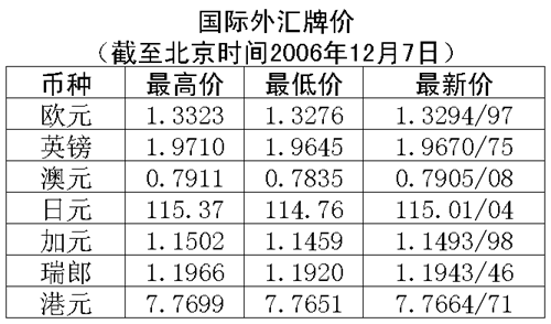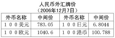 根據(jù)中國人民銀行授權(quán)中國外匯交易中心發(fā)布的公告,2006年12月7日銀行間外匯市場美元等交易貨幣對人民幣匯率的中間價為:1美元兌人民幣7.8305元,1歐元兌人民幣10.4060元,100日元兌人民幣6.8044元,1港幣兌人民幣1.00788元,1英鎊兌人民幣15.3992元。在自動撮合交易系統(tǒng),美元收于人民幣7.8220元,低于6日收盤時的7.8226元,交易區(qū)為人民幣7.8290至7.8200元。在詢價交易市場,美元收于人民幣7.8236元,高于6日收盤時的7.8234元,盤中交易區(qū)為人民幣7.8290至7.8200元。在經(jīng)歷了前幾日的漲勢之后,人民幣今日對美元走勢基本平穩(wěn)。