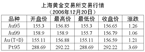 20日上海黃金交易所黃金Au99.95收盤(pán)于156.65元/克,上漲1.26元/克,共成交2082公斤;黃金Au99.99收盤(pán)于156.79元/克,上漲1.06元/克,共成交410.40公斤;鉑金Pt99.95收盤(pán)于292.22元/克,上漲3.69元/克,共成交150公斤。黃金Au(T+D)延期交易品種收盤(pán)于156.59元/克,上漲1.21元/克,共成交2928公斤。
