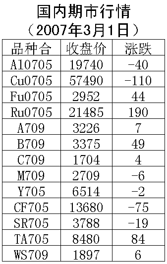 3月1日(周四),國內(nèi)期貨市場金屬下跌,能源類上漲。倫敦銅周三下跌25美元/噸,收盤6050美元/噸。滬銅704合約周四下跌200元/噸,收盤57540元/噸。倫敦鋁周三下跌17.5美元/噸,收盤2827美元/噸。滬鋁705合約周四下跌40元/噸,收盤19740元/噸。