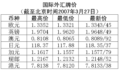 根據(jù)中國人民銀行授權(quán)中國外匯交易中心發(fā)布的公告,2007年3月27日銀行間外匯市場美元等交易貨幣對人民幣匯率的中間價為:1美元兌人民幣7.7343元,1歐元兌人民幣10.3097元,100日元兌人民幣6.5467元,1港幣兌人民幣0.98986元,1英鎊兌人民幣15.2250元。