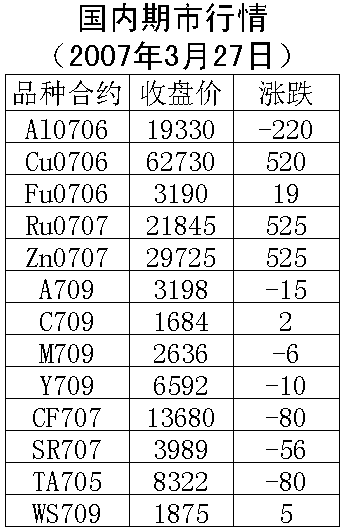 3月27日國(guó)內(nèi)期貨市場(chǎng)能源、農(nóng)產(chǎn)品價(jià)格上漲,金屬鋁價(jià)格下跌。倫敦銅周一上漲157.5美元/噸,收盤6885美元/噸。滬銅周二上漲520元/噸,收盤62730元/噸,支撐價(jià)位62000元一線,上漲壓力65000元一線。