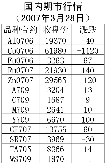 3月28日國(guó)內(nèi)期貨市場(chǎng)金、農(nóng)產(chǎn)品下跌,能源價(jià)格上漲。滬銅706合約下跌1120元/噸,收盤61980元/噸,支撐60000元一線,上漲壓力65000元一線。滬鋁706合約下跌40元/噸,收盤19370元/噸,支撐19200元一線,上漲壓力19800元一線。