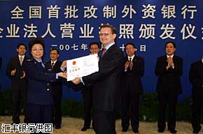 渣打、匯豐、花旗和東亞四家外資銀行29日獲得上海市工商行政管理局頒發(fā)的法人銀行營(yíng)業(yè)執(zhí)照,這標(biāo)志著全國(guó)首批經(jīng)過(guò)改制的外資銀行正式取得中國(guó)企業(yè)法人地位。記者同時(shí)獲悉,這四家銀行預(yù)計(jì)下周將正式開(kāi)業(yè)。