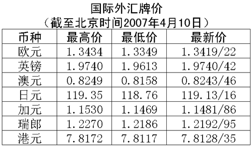 根據(jù)中國人民銀行授權(quán)中國外匯交易中心發(fā)布的公告,2007年4月10日銀行間外匯市場美元等交易貨幣對人民幣匯率的中間價為:1美元兌人民幣7.7304元,1歐元兌人民幣10.3340元,100日元兌人民幣6.4877元,1港幣兌人民幣0.98893元,1英鎊兌人民幣15.1821元。