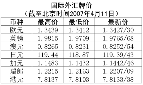 根據(jù)中國人民銀行授權(quán)中國外匯交易中心發(fā)布的公告,2007年4月11日銀行間外匯市場美元等交易貨幣對人民幣匯率的中間價為:1美元兌人民幣7.7270元,1歐元兌人民幣10.3708元,100日元兌人民幣6.4799元,1港幣兌人民幣0.98909元,1英鎊兌人民幣15.2384元。