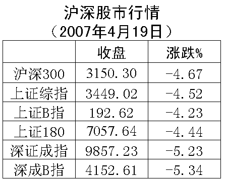 承接周三的下調(diào),滬深股市大盤19日低開后出現(xiàn)近一個(gè)月來(lái)少見(jiàn)的大規(guī)模深幅下跌:上證綜指和深證成指分別下跌163點(diǎn)和544點(diǎn),收?qǐng)?bào)于3449.02點(diǎn)和9857.23,跌幅為4.52%、5.23%。