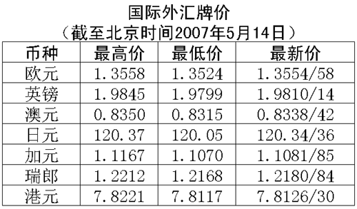 根據中國人民銀行授權中國外匯交易中心發(fā)布的公告,2007年5月14日銀行間外匯市場美元等交易貨幣對人民幣匯率的中間價為:1美元兌人民幣7.6739元,1歐元兌人民幣10.3866元,100日元兌人民幣6.3861元,1港幣兌人民幣0.98161元,1英鎊兌人民幣15.2150元。