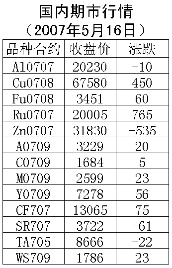東京橡膠周三上漲10日元/公斤,收盤283.8日元/公斤。滬膠707合約周三上漲765元/噸,收盤20005元/噸,達(dá)到漲停板明日漲跌幅度擴(kuò)大到6%。美原油周二上漲0.53美元/桶,收盤63.08美元/桶。滬燃油707合約周三上漲85元/噸,收盤3477元/噸,支撐價(jià)位3400元一線,上漲壓力3500元一線。