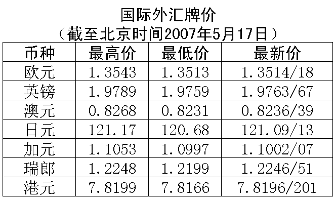 根據(jù)中國人民銀行授權(quán)中國外匯交易中心發(fā)布的公告,2007年5月17日銀行間外匯市場美元等交易貨幣對人民幣匯率的中間價為:1美元兌人民幣7.6785元,1歐元兌人民幣10.3875元,100日元兌人民幣6.3545元,1港幣兌人民幣0.98218元,1英鎊兌人民幣15.1858元。