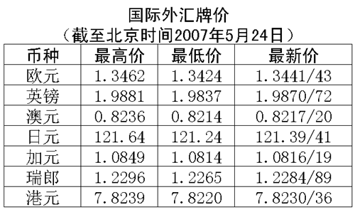 根據(jù)中國人民銀行授權(quán)中國外匯交易中心發(fā)布的公告,2007年5月24日銀行間外匯市場美元等交易貨幣對人民幣匯率的中間價為:1美元兌人民幣7.6525元,1歐元兌人民幣10.2953元,100日元兌人民幣6.2960元,1港幣兌人民幣0.97816元,1英鎊兌人民幣15.2002元。