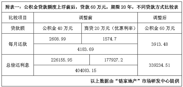 那么與商貸相比公積金貸款能為消費(fèi)者節(jié)省多少利息支出呢?對(duì)此,業(yè)內(nèi)人士為記者詳細(xì)算了一筆經(jīng)濟(jì)賬。 北京房產(chǎn)中介鏈家地產(chǎn)副總經(jīng)理金育松舉例子說(shuō),如果李先生購(gòu)買(mǎi)了一套價(jià)值75萬(wàn)元的房產(chǎn),最高貸款額度為60萬(wàn)元。李先生具有公積金貸款的條件,在貸款額度上調(diào)前,由于原公積金貸款最高額度為40萬(wàn)元,因此,李先生只能選擇公積金貸款40萬(wàn)元及商貸20萬(wàn)元的組合貸款,貸款年限20年;而在最高額度上調(diào)后,李先生所貸款的60萬(wàn)元,可全部選擇公積金貸款方式。為了方便對(duì)比參考,我們均采用等額本息還款法進(jìn)行計(jì)算,可以發(fā)現(xiàn)公積金貸款方式的優(yōu)勢(shì)十分明顯。(見(jiàn)附表一) 金育松說(shuō),通過(guò)表格對(duì)比可以看出,公積金貸款額度調(diào)高以后,60萬(wàn)元可全部使用公積金貸款,每月還款額比調(diào)整前的組合貸款少還270.21元,總償還利息可節(jié)省64848.64元。另外,辦理組合貸款比單純辦理公積金貸款手續(xù)更多、需時(shí)更長(zhǎng)、手續(xù)費(fèi)更多,部分購(gòu)房者甚至因?yàn)榻M合貸款太繁瑣轉(zhuǎn)而全部采用商貸,而此次公積金上浮最高額度后,部分購(gòu)房者可直接選用公積金貸款,既省錢(qián)又省時(shí)省心。 對(duì)此,殷麗娟表示贊同。她說(shuō),無(wú)論是與組合貸款方式進(jìn)行比較,還是單純將商貸與公積金貸款方式進(jìn)行比較優(yōu)勢(shì)都十分明顯。 殷麗娟舉例子說(shuō),比如,在國(guó)家某機(jī)關(guān)工作的唐先生想在北京亞運(yùn)村一帶買(mǎi)一套評(píng)估價(jià)為60萬(wàn)元、面積是70平方米的二居室。夫婦多年積攢了20萬(wàn)元,以唐先生貸款40萬(wàn)元買(mǎi)房為例,如果其貸款年限為15年,那么,按照商貸基準(zhǔn)利率7.20%計(jì)算,等額本息還款方式月供為3640.19元,而公積金適用利率為4.86%,同樣方式月供是3134.08元,如果不提前還款兩者相比較公積金總共比商貸共節(jié)省91099.29元。即使在優(yōu)惠利率下,公積金仍比商貸節(jié)省約48120.30元。由此可見(jiàn),公積金貸款買(mǎi)房省錢(qián)優(yōu)勢(shì)明顯。