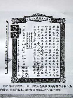 張謇的集資難,比較典型的反映了19世紀(jì)末20世紀(jì)初轉(zhuǎn)型期中國社會中的一種正常現(xiàn)象。 當(dāng)然,在大生紗廠迭獲利潤,張謇也“稍獲資本家之信用”后,情況就會大不一樣了,此后,張謇在籌辦大生分廠時,“不一年而得投資者六十余萬”的事實就證明了這一點。 這里介紹的大生企業(yè)集團(tuán)的第二個特點,是它在快速擴(kuò)張中的一種集資方式。 大生紗廠獲利之后,在短短的10多年時間里,張謇的企業(yè)從一個擴(kuò)大到20多個,包括紡織、印染、航運(yùn)、面粉、鹽業(yè)、鐵冶等等,還投資10余個其它企業(yè),形成了一個以紡織為主跨行業(yè)的資本企業(yè)集團(tuán)。另外,張謇還在南通投資創(chuàng)辦了中國第一所紡織學(xué)校,第一個師范學(xué)校、第一個博物館……在南通的城市建設(shè)和現(xiàn)代化發(fā)展方面,發(fā)揮了很大的作用。 張謇曾對人說:“我們?nèi)寮,有一句扼要而不可動搖的名言‘天地之大德曰生’。這句話的解釋,就是說一切政治及學(xué)問最低的期望,要使得大多數(shù)的老百姓,都能得到最低水平線上的生活”。因此,他把自己創(chuàng)辦的企業(yè)命名為“大生”,就是“天地之大德曰生”的涵義。如果說,張謇的這種做法,是秉持他自己的信念,那么,創(chuàng)辦這些企業(yè)和社會公益事業(yè)的資金從何而來?除向社會籌集外,將企業(yè)經(jīng)營利潤轉(zhuǎn)為股份,壯大自身實力和競爭力量,爭取獲取更多利潤興辦更多實業(yè)和社會公益事業(yè)是張謇的主要辦法。這張“中華民國”4年發(fā)行的“南通大生紡織公司股票”,票面文字中有“南通大生紡織公司為添給股票事,本公司按照辛亥年股東會議決,以歷年截存余利作為添購紗錠織機(jī)股本,每股規(guī)銀五拾兩,按戶填給……”的字樣,就是張謇將企業(yè)利潤轉(zhuǎn)為企業(yè)股票的見證。因此,票面中有“添字第……號”的排號,這種股票也被稱為“添字股票”。這種以截存企業(yè)利潤轉(zhuǎn)為股份被稱為“添字股票”的事例,在中國近代是很有特色的一種股票。