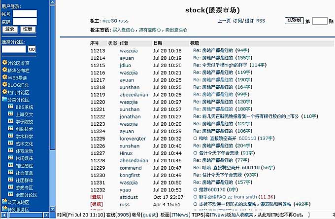 大學(xué)生炒股高度網(wǎng)絡(luò)化。圖中背景是上海交通大學(xué)飲水思源BBS上的“股票市場(chǎng)”討論區(qū)?,該討論區(qū)的版主寄語(yǔ)是:買入靠信心,持有靠耐心,賣出靠決心。唐瑾瑾
