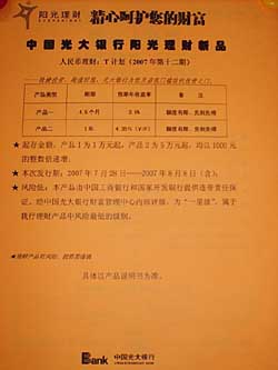 “陽光理財T計劃”是光大銀行推出的人民幣信托投資理財產(chǎn)品,今年已經(jīng)發(fā)行了12期。本報實習(xí)生 唐瑾瑾