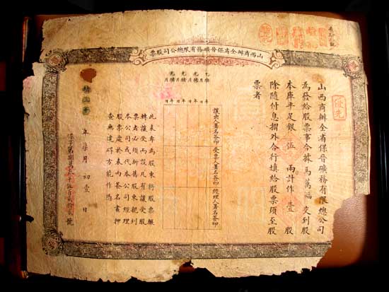 這張“山西商辦全省保晉礦務(wù)有限總公司股票”,就是在這次保晉活動(dòng)中由山西民眾集資創(chuàng)辦,與英商福公司爭(zhēng)奪礦權(quán)成立的公司的股票,是這段歷史的實(shí)物見(jiàn)證,F(xiàn)在我們就來(lái)觀察一下這張股票:先看正面,在這張股票的最右面,有“優(yōu)先”二字紅色印章,接著是“山西商辦全省保晉礦務(wù)有限總公司為發(fā)給股票事今據(jù)馬萬(wàn)福交到股本庫(kù)平足銀五兩計(jì)作壹股……”的字樣,這家公司將每股股票的金額定的很低,是為了從盡可能大的范圍內(nèi)盡快籌集資金,而“優(yōu)先”的字樣表明這是優(yōu)先股,通過(guò)股票背面的文字:“如在第一期將股交足,謂之優(yōu)先股,每股少交銀四錢(qián),作為一年提前支付之股息”的規(guī)定,我們知道,在收取這每股五兩的股金時(shí),為照顧廣大一般民眾,股票的股金定為分三次收取。但如果能夠一次交足,就可以作為優(yōu)先股,每股少交銀四錢(qián),“作為一年提前支付之股息”,有獎(jiǎng)勵(lì)和優(yōu)惠的性質(zhì)在內(nèi),目的在于爭(zhēng)取盡快多收取興辦公司的資金。 股票正中有一個(gè)表,上端有光緒年月日的字樣,另分“讓出人署名簽印、受票人署名簽印、經(jīng)理人署名簽印”三欄,左邊是對(duì)這三欄的文字說(shuō)明:“此表專(zhuān)為股東將股票輾轉(zhuǎn)讓受而設(shè),凡有讓受股票者,必須新舊股東親到本公司或代本公司經(jīng)理股票處于表內(nèi)簽名畫(huà)押,查無(wú)違礙方能作憑”的字樣。顯然,這是為股票轉(zhuǎn)讓買(mǎi)賣(mài)而預(yù)留的地方。但奇怪的是,一般公司股票所設(shè)的這個(gè)欄目都印刷在股票的背面,而這張股票卻將這個(gè)欄目印在股票的正面中間,加上要求轉(zhuǎn)讓時(shí)新舊股東必須同時(shí)親到經(jīng)理股票處辦理的文字說(shuō)明,頗有些不同尋常。實(shí)際上,因?yàn)檫@是從外國(guó)帝國(guó)主義列強(qiáng)手中爭(zhēng)回礦權(quán)的股票,因此對(duì)股東的身份有嚴(yán)格的限制。“保晉礦務(wù)總公司簡(jiǎn)章”的第五條就明確規(guī)定:“本公司唯收華股不收洋股,附股者如私將股票售與外人,經(jīng)本公司查知或經(jīng)他人轉(zhuǎn)告,立將所入之股注銷(xiāo)不認(rèn)”。原來(lái),該股票對(duì)股東的轉(zhuǎn)讓和身份十分注重,就是為了保證股東中不能出現(xiàn)外國(guó)人。 股票最左邊年代的地方雖有破損和缺字,但依然可看出是“光緒三十年七月初一日”和“保字第捌萬(wàn)叁千伍佰貳拾貳號(hào)”的字樣。這里需要有一點(diǎn)說(shuō)明,即一般的歷史書(shū)在提到保晉礦務(wù)有限總公司時(shí),都指出其成立年份為光緒三十二(1906)年,光緒三十三(1907)年在農(nóng)工商部奏準(zhǔn)正式立案。但這里顯示的這張股票是光緒三十(1904)年七月一號(hào)所發(fā),且股票的號(hào)碼已經(jīng)排到8萬(wàn)多號(hào),從股票號(hào)碼數(shù)來(lái)看該公司不會(huì)是剛剛成立,那怎么解釋這個(gè)現(xiàn)象呢?可能的解釋是過(guò)去的記載不夠準(zhǔn)確,因?yàn)樯轿魃剔k保晉礦務(wù)總公司成立有籌辦及擴(kuò)大的過(guò)程,前面一個(gè)階段因沒(méi)有在農(nóng)工商部立案故未留下記錄。 這種解釋可從歷史檔案中得到旁證:據(jù)臺(tái)灣編的《礦務(wù)檔》記載,光緒二十九(1903)年二月,山西巡撫奏折中即有反映晉省紳商為抵制福公司開(kāi)礦,聯(lián)名稟稱(chēng)愿意籌集股本設(shè)立礦務(wù)總公司,山西巡撫給予批準(zhǔn)并報(bào)告清廷的記載。其中要求籌集資本創(chuàng)辦公司的紳商為首之人渠本翹,正是此后在農(nóng)工商部注冊(cè)立案的“山西商辦全省保晉礦務(wù)有限總公司”的總理,也是在從福公司贖回礦權(quán)籌集贖金的過(guò)程中立下大功的人物。 股票的背面是滿滿的文字,是該公司章程內(nèi)容的擇要刊登。股票雖有缺損,但章程主要內(nèi)容基本上還能夠看得清楚。與當(dāng)時(shí)其它股票相比,其中值得注意的地方有三點(diǎn):一是右面第一行文字開(kāi)始,是該公司分領(lǐng)“奏準(zhǔn)展限之畝捐”“一律作為五兩一股”“公股”的規(guī)定,這段文字證明,“山西商辦全省保晉礦務(wù)有限總公司”的創(chuàng)辦,得到了當(dāng)時(shí)執(zhí)政者的支持,開(kāi)辦資金中還有得到批準(zhǔn)可以緩交的地畝捐。地畝捐在這里被當(dāng)作“公股”看待。二是下面的文字有“本公司除畝捐外,擬再集資本三百萬(wàn)兩……”的記載,說(shuō)明當(dāng)時(shí)這家為收回山西礦權(quán)而開(kāi)辦的公司,計(jì)劃的資金規(guī)模很大,除民間籌集外,還有“將官款及地方各項(xiàng)公款撥入公司為股本者,亦以五兩為一股,給票付息”的明確規(guī)定,足以證明當(dāng)時(shí)山西各階層民眾為收回礦權(quán),采取了各種方式籌集資金。其三,背面文字中還有“凡有以礦地作股者,按地作價(jià),按價(jià)分股,仍以五兩為一股,一律填給股票息折,毫無(wú)歧視”的規(guī)定。這條規(guī)定,同樣證明在當(dāng)時(shí)籌集資本成立這家公司時(shí),采取了多種多樣靈活的方式,甚至可以將礦地折價(jià)作股加入公司,盡可能的起到了動(dòng)員民眾的作用。 歷經(jīng)百年的歲月風(fēng)云,留存下來(lái)的這張老股票已經(jīng)相當(dāng)破舊,但從這張破